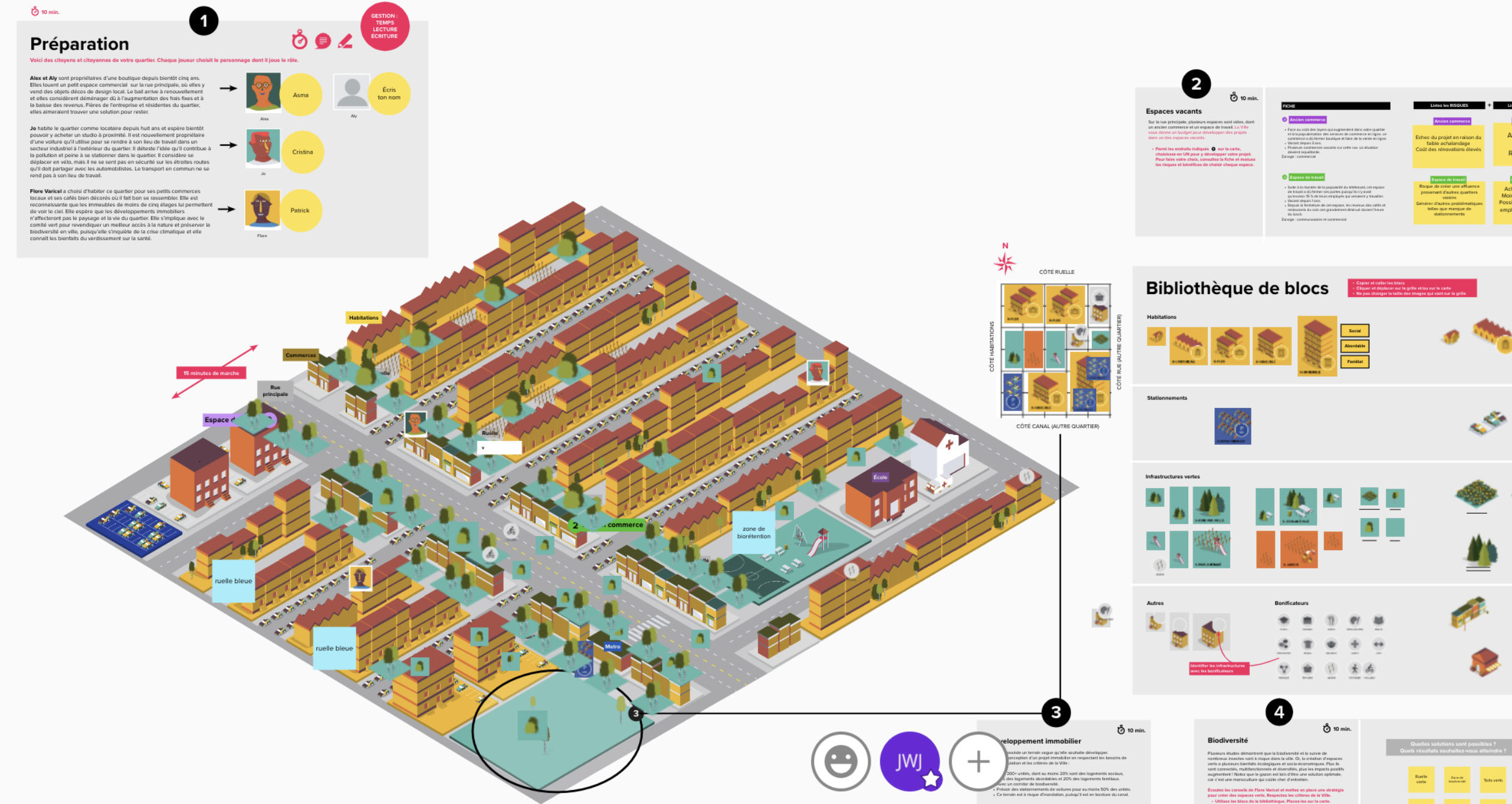 This game is a digital extension of City Builders. Participants learn the impact of urban design on the environment. Designed for citizens to gain tools to get involved in civic participation and to bridge the gap between city planners, urbanists, and citizens. Teams build infrastructures, refurbish streets, and propose regulations related to urban design to respond to needs when facing social challenges and climate emergencies caused partly by the lack of density. The game includes 4 game worlds, 9 levels, and 12 player roles.