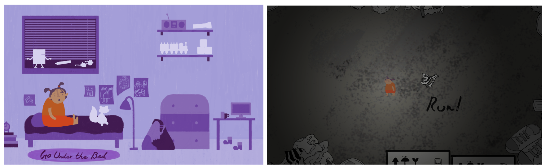 All visual art was generated in-house, using a variety of styles that highlight the stark difference between the Girl’s world (herself, her room, her toys) and the nightmare world under the bed. Most of the assets are hand-drawn, with simplified frame-by-frame animations that exploit the difference in styles to contrast who the Girl is, her world, and what she is not afraid of versus her nightmares and what she is scared of. The colour palettes reinforce this effect, the colourful outside world and the monsters in grayscale.
